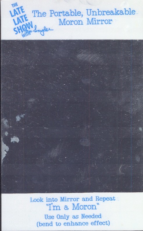 I had a dream one Sunday night of making a Moron Mirror that would be available whenever and where ever the need arose. I had some pieces of reflective plastic laying around that I picked up for strobe circuits and such. So Monday morning, I set about making it. It took me most of the morning, using my Commodore 64 and copy machine. I sent two copies to Tom, and he featured them that Friday night (6/26/96) on his show. Here is a scanned copy of the mirror. (Note: The reflective surface shows up as black here)